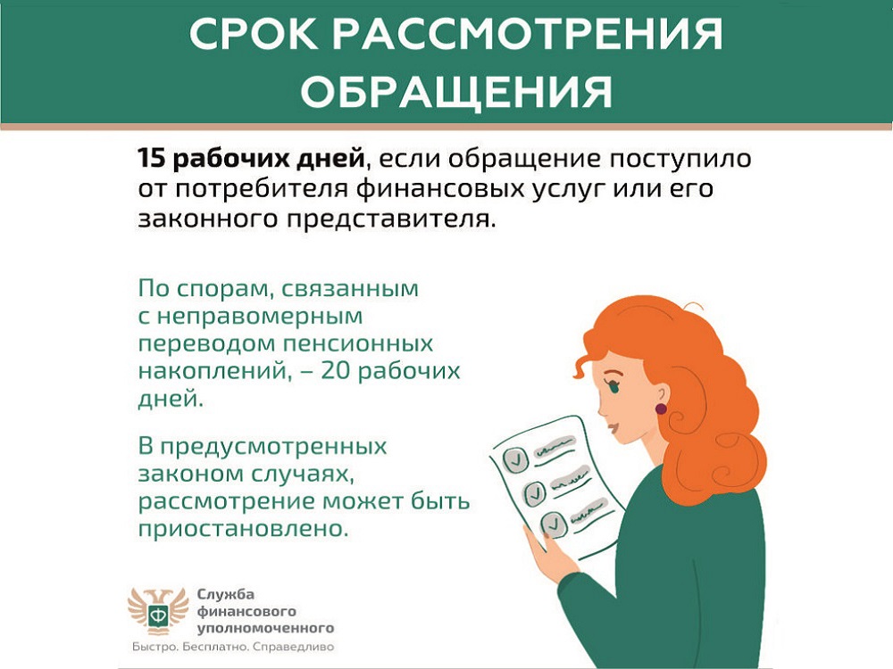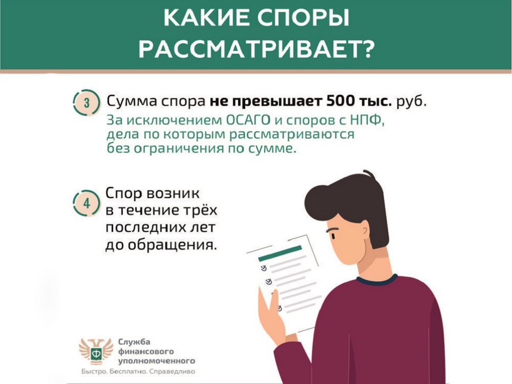 Финансовый уполномоченный решает имущественные (например, денежные) споры без суда между финансовыми организациями и их клиентами – физическими лицами. Это обязательный порядок решения споров по закону. Не нужно терять время и деньги на экспертизы и юристов. Вся процедура бесплатная: от приема обращения до принятия решения. Ваши обращения финансовый уполномоченный рассматривает 15 рабочих дней (по спорам, связанным с неправомерным переводом пенсионных накоплений, – 20 рабочих дней) – без вашего визита. Никуда не нужно ходить. Решение финансового уполномоченного обязательно для исполнения финансовой организацией. Вы можете подать обращение в отношении страховой компании, банка, микрофинансовой организации, негосударственного пенсионного фонда, ломбарда и кредитного потребительского кооператива. Проверьте свой спор на официальном сайте финансового уполномоченного finombudsman.ru: подлежит ли он рассмотрению финансовым уполномоченным? Это можно сделать, ответив всего на несколько простых вопросов. Перед подачей обращения финансовому уполномоченному – направьте заявление о восстановлении нарушенного права (претензию) в финансовую организацию, с которой у вас возник имущественный (например, денежный) спор. Если спор с финансовой организацией не урегулирован – подайте обращение финансовому уполномоченному на его официальном сайте или через МФЦ Кемеровской области. Более подробную информацию вы можете получить здесь.