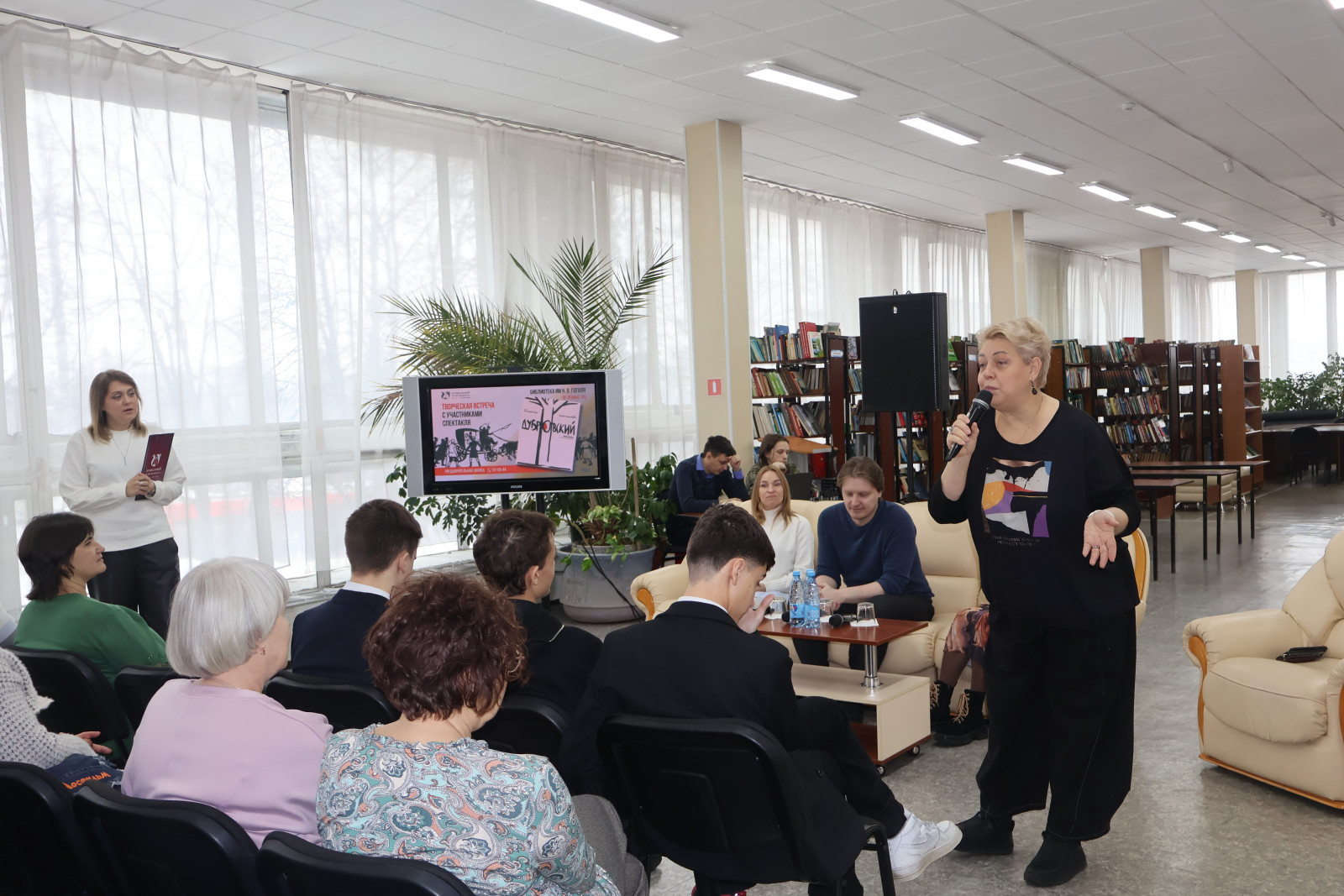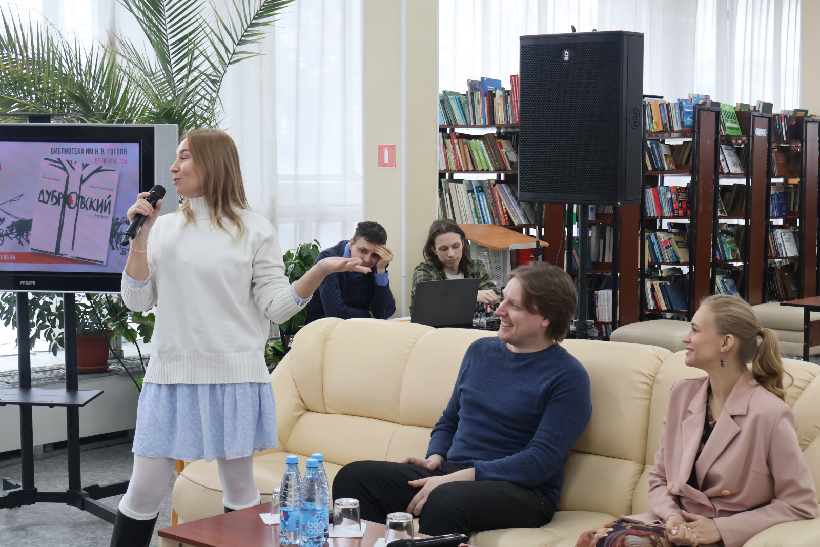 11 февраля 2026 года Библиотека им. Н. В. Гоголя (пр-т Ленина, 135) стала площадкой для обсуждения драматического мюзикла «Дубровский», созданного по мотивам повести А. С. Пушкина. Программу открыла интеллектуальная викторина «Пушкин вне времени», победители которой получили памятные сувениры. О творческом пути и работе над спектаклем гостям рассказали блистательные солисты – Светлана Мухтарума, Антон Грошев и Юлия Рычкова.