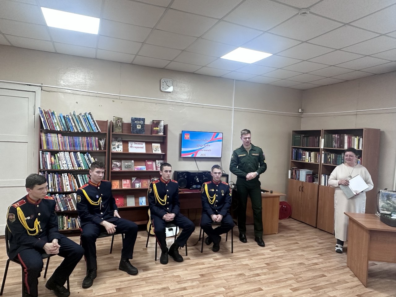 Встречи с кадетами в библиотеке – это многолетняя добрая традиция. Гостями приема стали полковник Казаков Василий Петрович – ветеран боевых действий, почетный ветеран г. Кемерово, кавалер ордена Мужества; подполковник Веселов Вадим Владимирович – ветеран боевых действий помощник командира войсковой части 6607 по работе с ветеранами; Цветкова Людмила Владимировна – мать Героя РФ Цветкова Сергея Евгеньевича, а также советник директора по воспитанию МБОУ «Средняя общеобразовательная школа № 90» Бакланова Надежда Сергеевна.