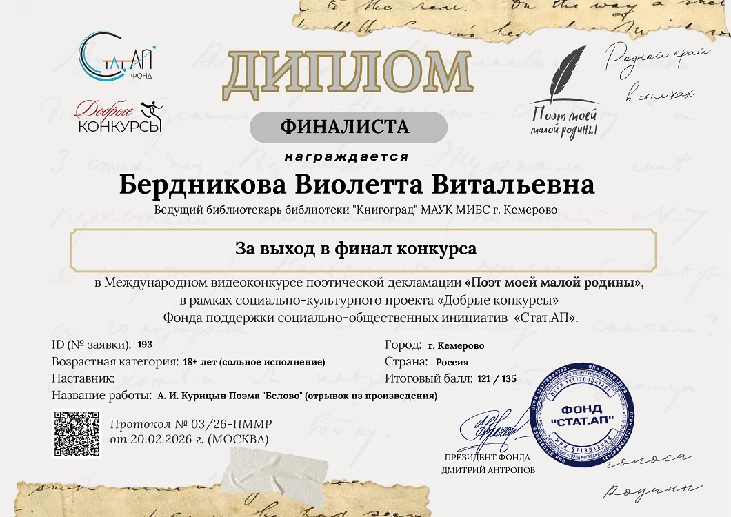 Поздравляем коллегу Виолетту Витальевну Бердникову ведущего библиотекаря библиотеки «Книгоград», с Дипломом финалиста.